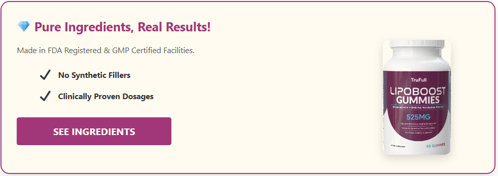 TruFull LipoBoost Gummies bring a pleasant-tasting, convenient alternative to a category still saturated with aggressive promises. By combining green tea, L-Carnitine, chromium and supporting botanicals it addresses fat oxidation, appetite moderation and daily energy from a gentle entry point — one that can make healthier eating choices feel less forced after several consistent weeks. While it will never deliver overnight scale changes or guaranteed outcomes, a meaningful proportion of regular users describe flatter energy curves, noticeably reduced snacking urges and gradual body-composition progress. Results vary substantially depending on starting diet quality, activity level and realistic expectations, but the enjoyable format, mild profile and money-back windows make it one of the lower-risk participants in the natural metabolic-support field. Solid daily habits remain the foundation — TruFull can function as a sensible, low-key companion along the path.
